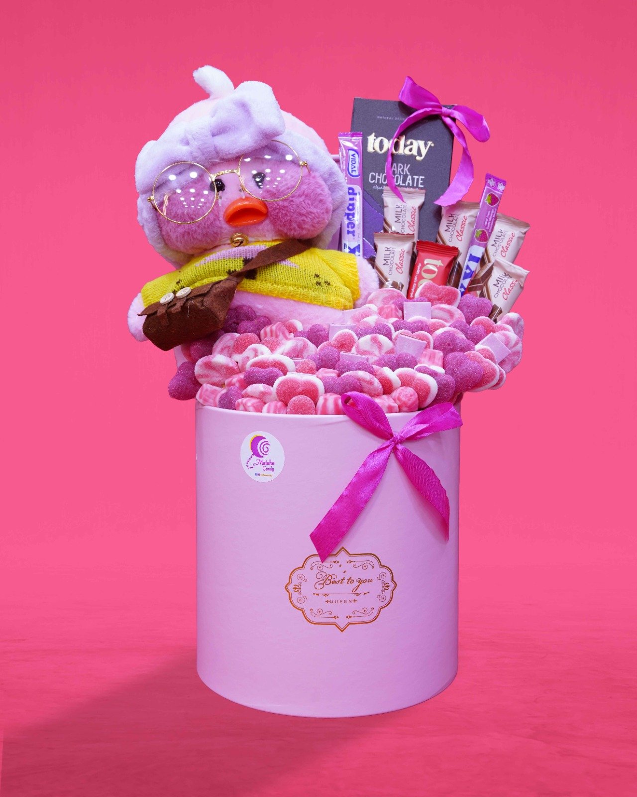 لإضافة لمسة شخصية ودافئة، يأتي هذا الصندوق مع دبدوب صغير ولطيف مزود بنظارات تضيف الطابع المرح والتميّز. يمكن للدبدوب أن يصبح تذكارًا دائمًا للمناسبة، ويبقى هنا ليذكر المتلقي باللحظات الجميلة التي شاركتموها معًا.